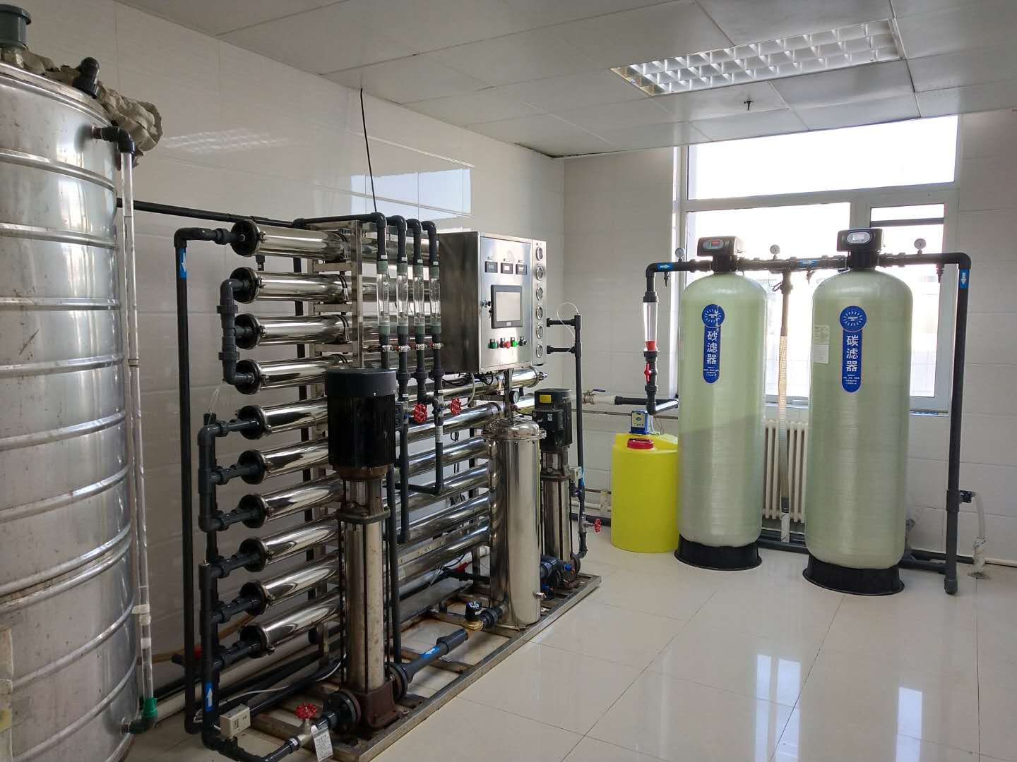 其流程如下:原水→原水加壓泵→多介質過濾器→活性炭過濾器→軟水器→精密過濾器→一級反滲透 →PH調節→中間水箱→二級反滲透→純水箱→純水泵→微孔過濾器→用水點。